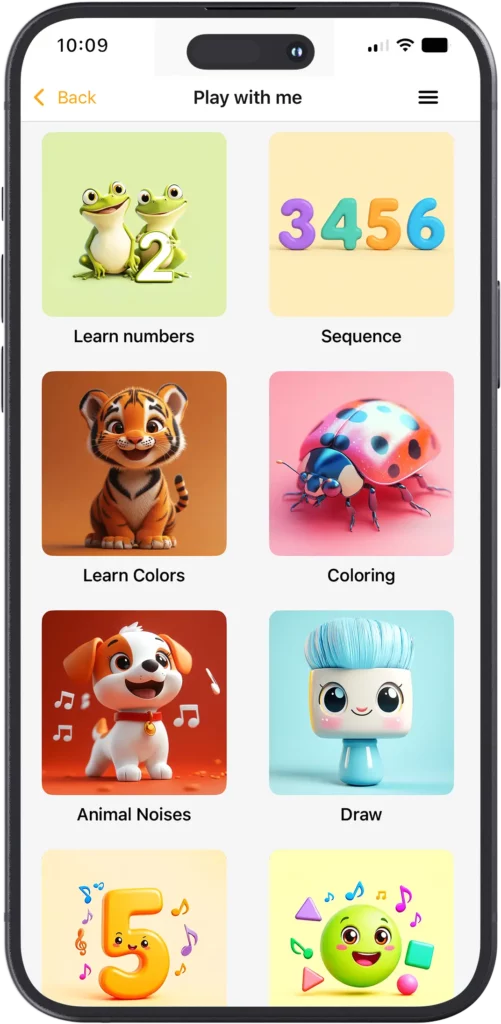 You learn best when you hear and repeat! In this game, the child will see pictures of numbers, letters, and words from various categories—animals, fruits, vegetables, emotions, and many more. With a single touch, they will hear the correct pronunciation and easily remember the new words!
